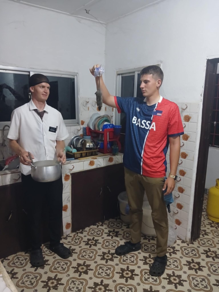 – Friday evening I was making a lapa tie when I hear Elder Jones start screaming like a little girl in the kitchen. He came running in and said “Elder there’s a rat!!!” So Elder Tshomba, Jones, and I sprinted to the kitchen to kill this thing. It out maneuvered us in the kitchen and ran to the living room. And so the chase began. Then we were all screaming like little girls. We spent the next 10 minutes flipping over couches, chairs, our stove, fridge, and rice bucket until we finally got that sucker. At least. Now there’s only infinity more to kill.